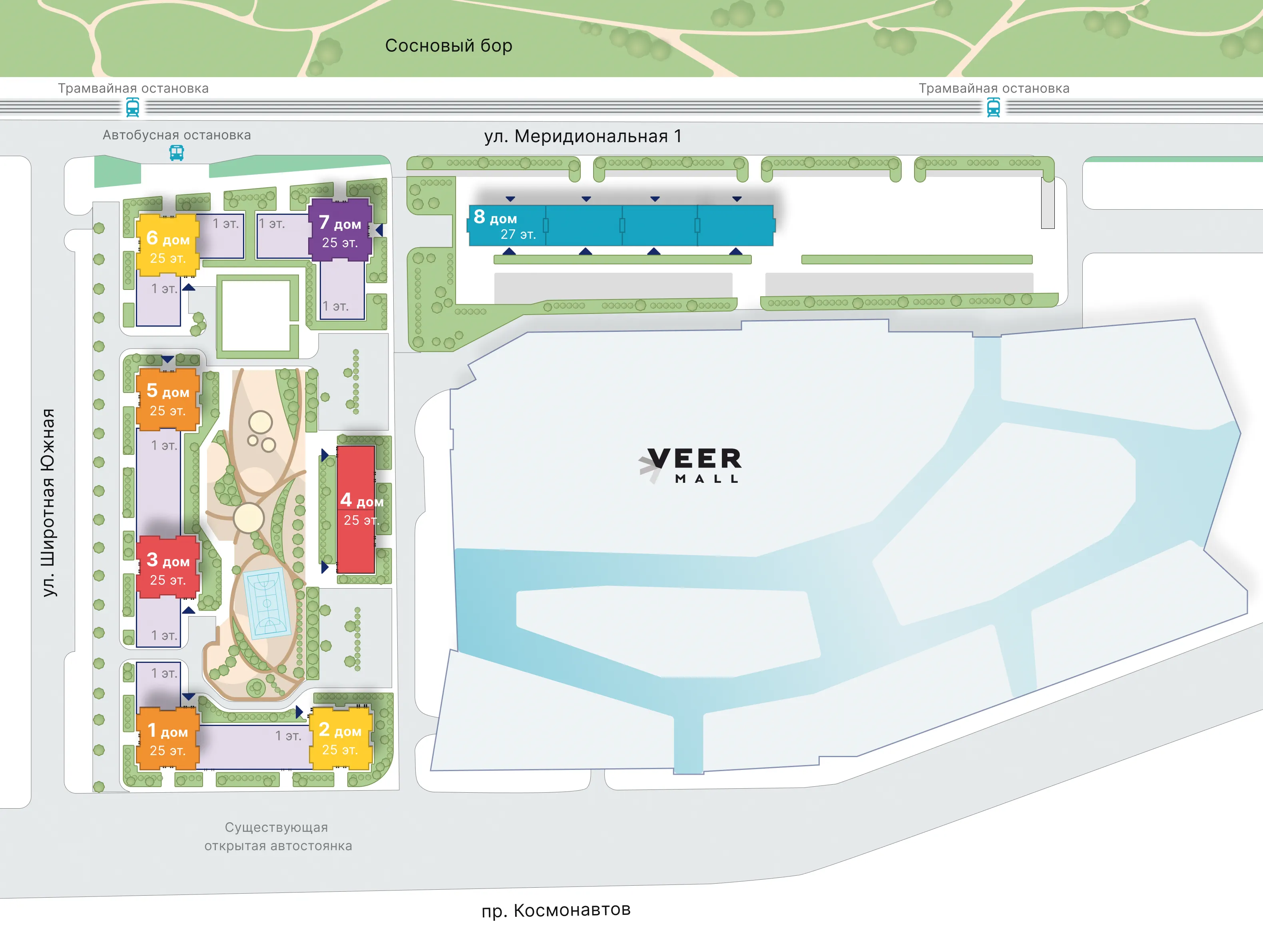 ЖК «Веер парк» — это современный жилой квартал с 9 многоэтажными жилыми домами рядом с ТРЦ “Веер Молл” на проспекте Космонавтов.